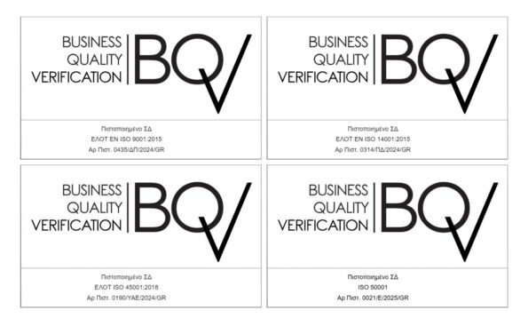 - Ποιότητα ISO 50001:2018 Επιβεβαιώνει ότι η εταιρεία υιοθετεί αποτελεσματικές πρακτικές διαχείρισης ενέργειας. Στόχος είναι η μείωση της κατανάλωσης, η αύξηση της ενεργειακής απόδοσης και η προώθηση βιώσιμων λύσεων κατά την εκτέλεση έργων και λειτουργιών.
